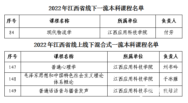 江西新闻客户端讯(严远磊)近日,江西应用科技学院4门课程获得江西省一流本科课程认定,取得课程建设的新突破。其中,由江西应用科技学院刘书吟老师的“普通心理学”、于冰雁老师的“毛泽东思想和中国特色社会主义理论体系概论”、张培梁老师的“普通话语音与播音发声”课程,获得“线上线下混合式一流本科课程”认定,付芳老师的“现代物流学”获得“线下一流本科课程”认定。