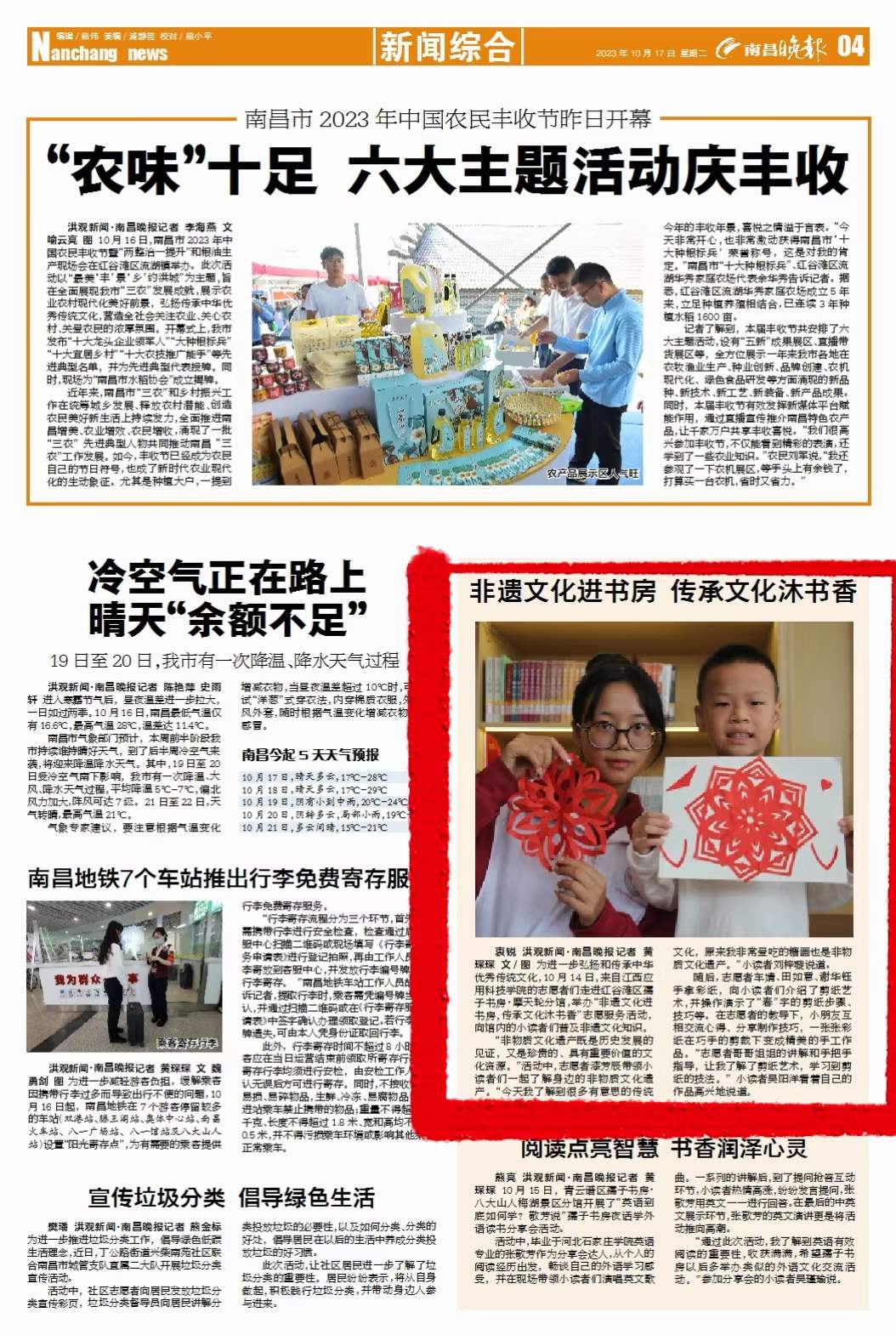 洪观新闻客户端讯(衷锐 全媒体记者 黄琛琛 文/图)为进一步弘扬和传承中华优秀传统文化,10月14日,来自江西应用科技学院的志愿者们走进红谷滩区孺子书房·摩天轮分馆,举办“非遗文化进书房,传承文化沐书香”志愿服务活动,向馆内的小读者们普及非遗文化知识。