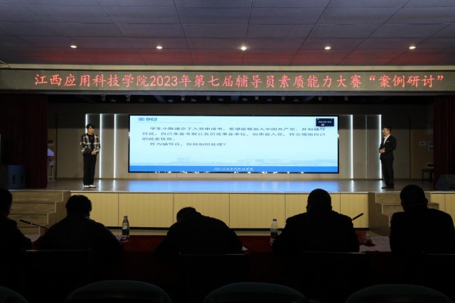 近日,由江西应用科技学院学工处主办的第七届辅导员职业能力大赛在学校产教融合一楼演播大厅举行。学校纪委书记江星、副校长谢远健到场指导比赛,相关职能部门负责人、各二级学院党总支书记、学工科长、部分专兼职辅导员到场观摩。