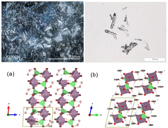 范光钼矿是具有全新化学成分和晶体结构的磷钼酸盐新矿物,晶体中MoO5H2O八面体和PO3OH四面体互联形成双链构造,链间分布通道水,链间通道水和晶体结构对环境温度和湿度极为敏感,揭示了新的矿物晶体化学现象,预示其在医药、化工、环保领域中具有重要的应用潜力。范光钼矿属于铀-钼矿床浅部的次生矿物,其中的钼与磷是重要的工农业原料,有着广泛的应用范围。