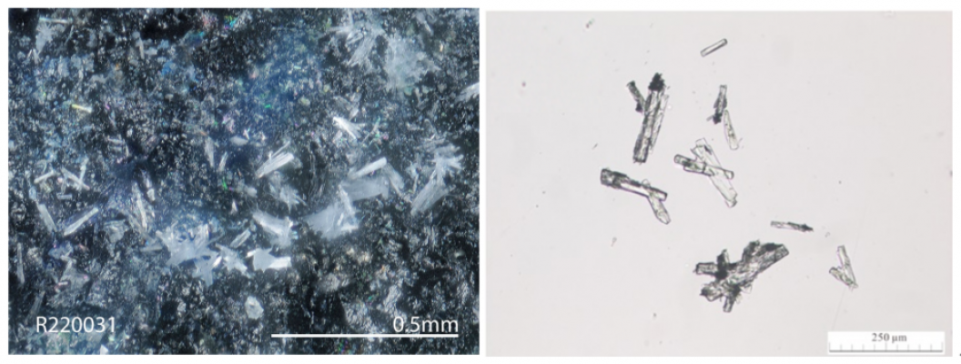 图2范光钼矿的标本(蓝钼矿基质中灰白色片状范光钼矿晶体)及范光钼矿单晶体显微镜图像