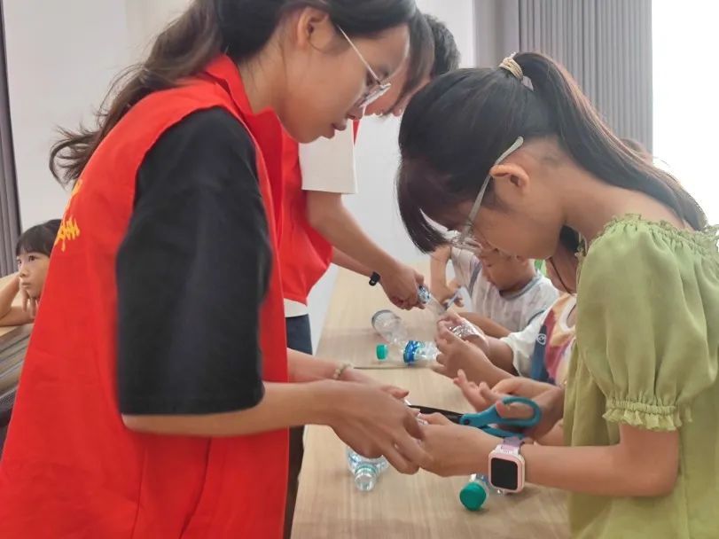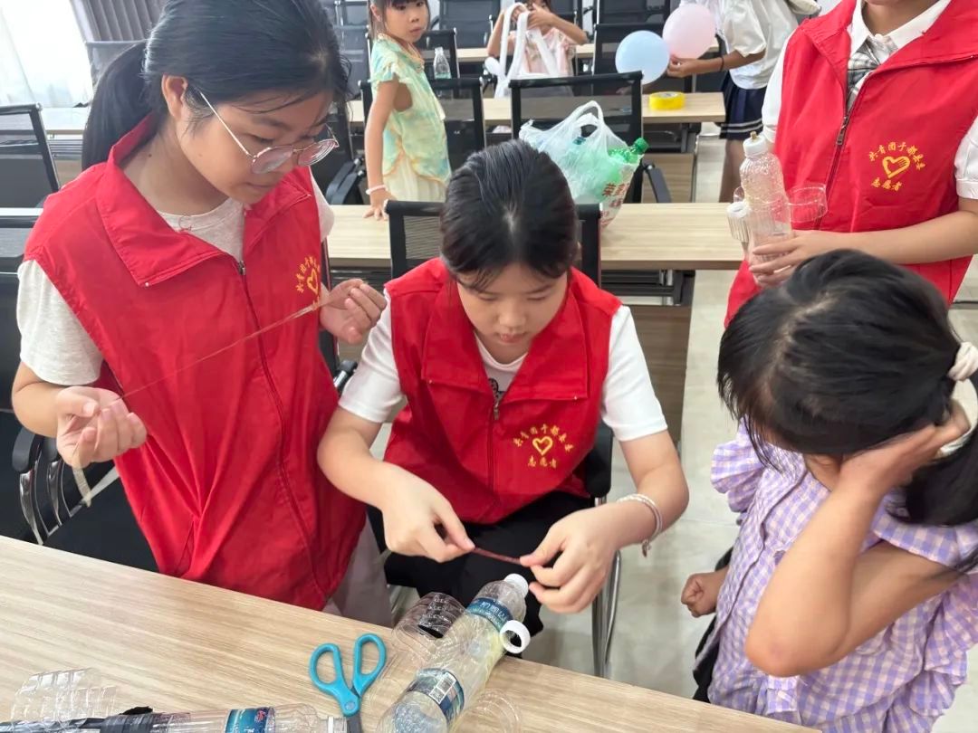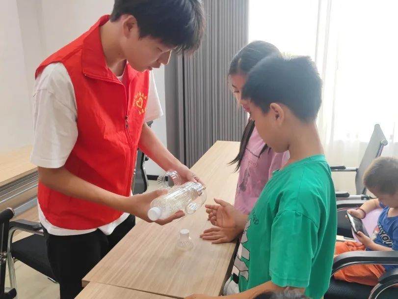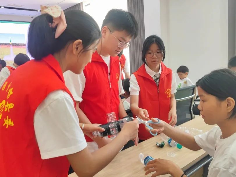 在活动中,为了提高孩子们对于我国火箭事业发展的了解,实践队员们通过视频讲解、互动问答、实践操作的方式引导孩子们利用矿泉水瓶、打气筒等材料制作水火箭,培养了他们的动手能力和创新思维。