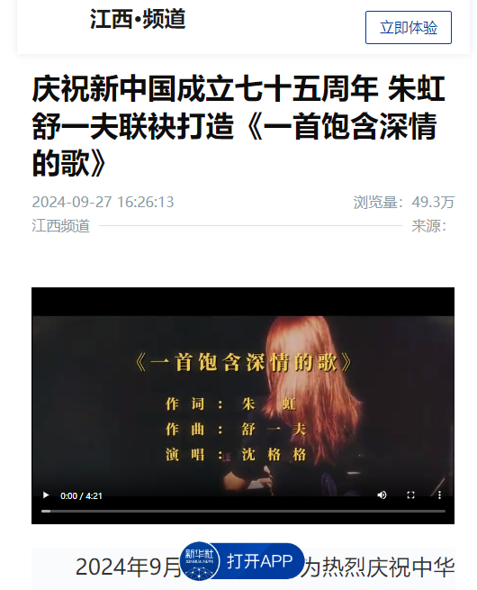 2024年9月26日上午,为热烈庆祝中华人民共和国成立75周年,由朱虹作词,舒一夫谱曲,江西应用科技学院青年教师沈格格倾情演唱的《一首饱含深情的歌》在江西应用科技学院举行了新歌MV发布会。