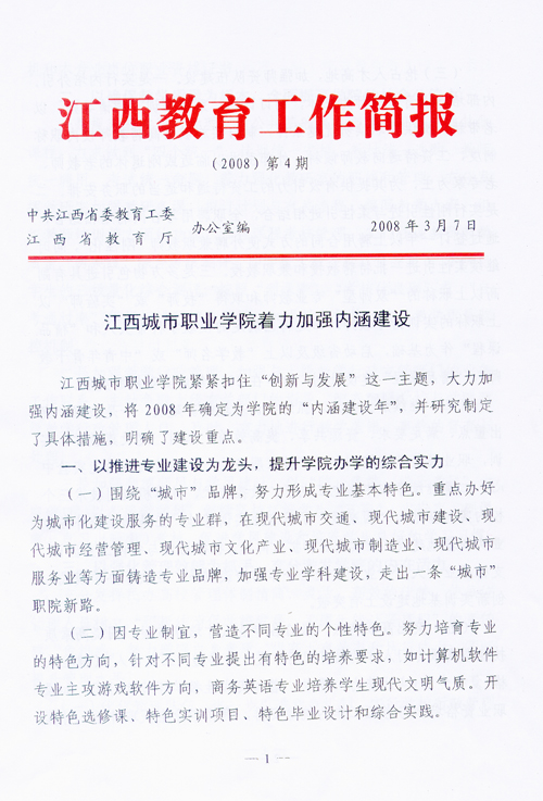 江西城市学院紧紧扣住“创新与发展”这一主题,大力加强内涵建设,将2008年确定为学院的“内涵建设年”,并研究制定了具体措施,明确了建设重点。