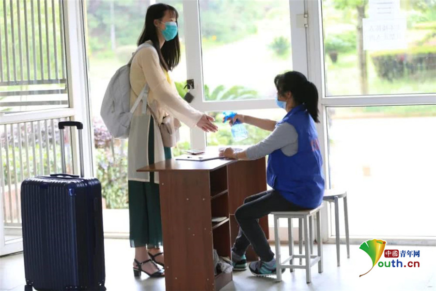 工作人员对住宿学生进行入住登记、体温检测、手部消毒。黄愈 摄
