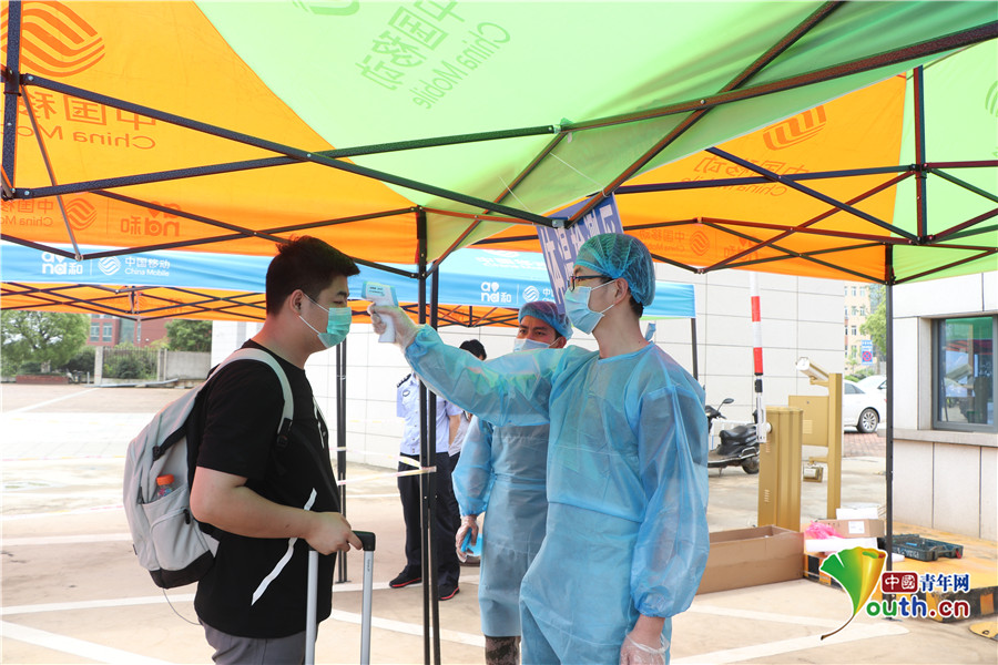 工作人员对学生进行体温检测。黄愈 摄