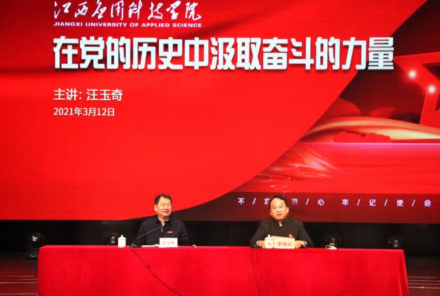 3月12日下午,江西应用科技学院2021年春季学期“开学第一课”在音乐厅举行。学校党委书记彭迪云主持报告会并讲话,副董事长、二级研究员汪玉奇以“在党的历史中汲取奋斗力量”为题,线上线下同步开讲“开学第一课”,千余名师生现场聆听报告。