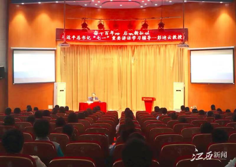 江西新闻客户端讯 11月4日上午,为深入学习贯彻习近平总书记在庆祝中国共产党成立100周年大会上的重要讲话精神,学校党委书记、政府督导专员彭迪云教授走进红色大讲堂,以“奋斗百年路,启航新征程”为主题,为全校师生带来了一场精彩的学习讲座。按防疫要求,现场师生隔位相坐,其他师生通过在线直播收看学习。