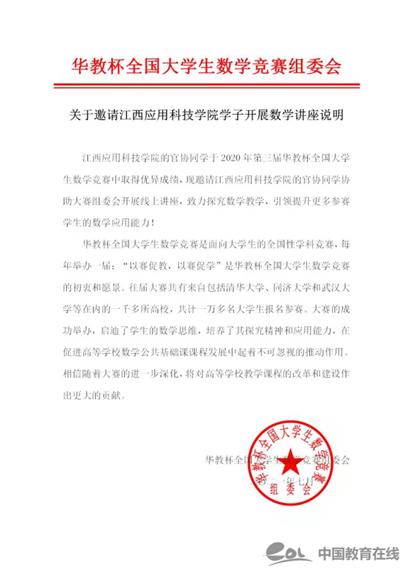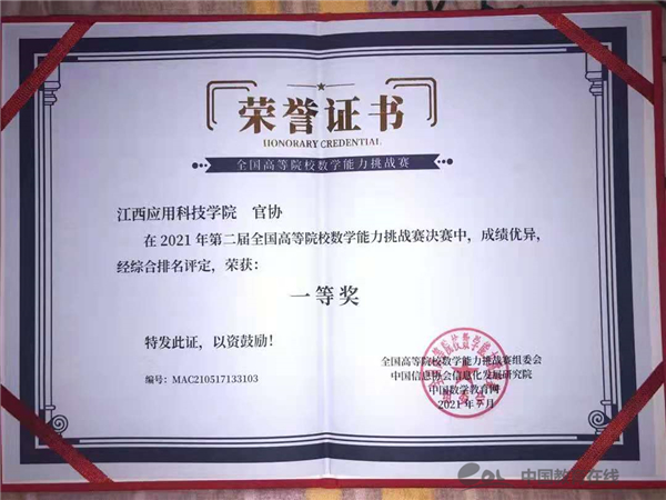 中国教育在线讯近日,由中国信息协会信息化发展研究院和中国数学教育网联合主办的2021年第二届全国高等院校数学能力挑战赛顺利落下帷幕。江西应用科技学院官协在全国决赛中获一等奖,并受到“华教杯”全国大学生数学竞赛组委会邀请开展线上讲座。