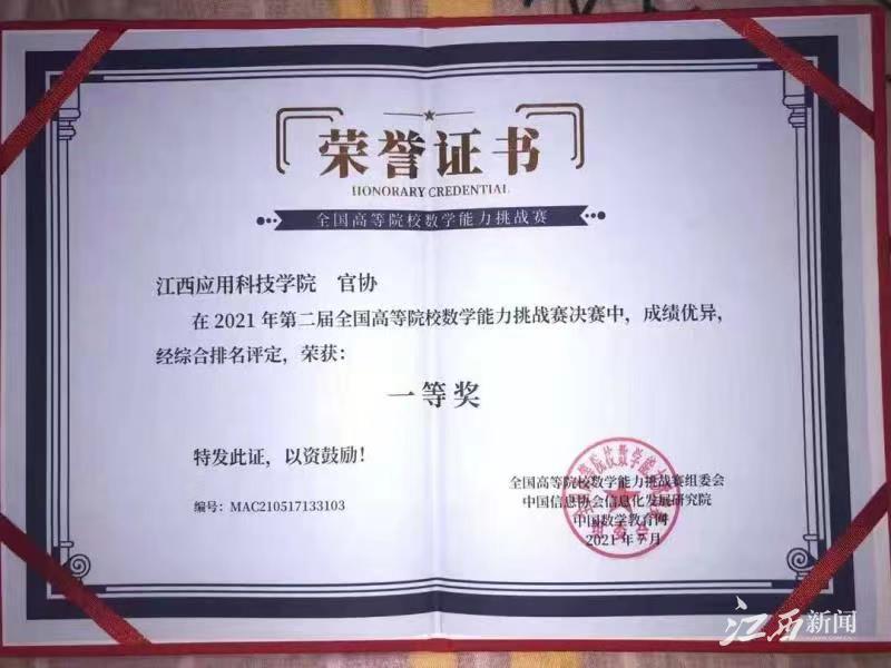 江西新闻客户端讯 近日,由中国信息协会信息化发展研究院和中国数学教育网联合主办的2021年第二届全国高等院校数学能力挑战赛顺利落下帷幕。江西应用科技学院学子官协在全国决赛中获一等奖,并受到“华教杯”全国大学生数学竞赛组委会邀请开展线上讲座。