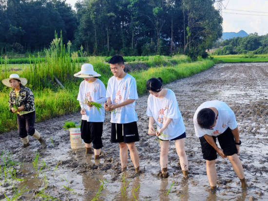 随后主动提出下田劳作,稻田插秧,他们先将稻苗运送之稻田,随后实践团成员们开启了前所未有的插秧体验。他们脱掉拖鞋,放好随身物品,轻装上阵,踩入泥泞的秧田,两脚一前一后立在泥土里,将一棵棵稻苗插入泥地里。绿油油的秧苗和大家辛勤劳作的身影,构成了一幅幅美妙的劳动画卷。