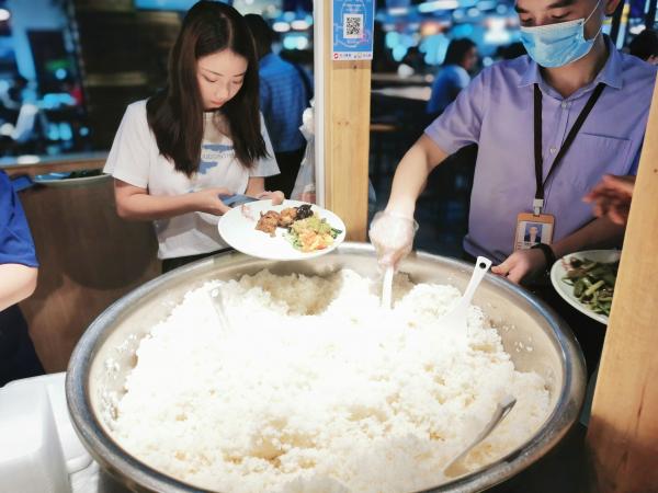 同学们纷纷在窗口排起了长队,在选择了需要的菜品后,自己去盛饭舀汤。同学们表示,学校这个举措很暖心,对有的家庭条件一般的孩子来说,这样的免费米饭可以给他们节省出更多学习费用。还有的同学说,自己打米饭,吃多吃少自己控制,杜绝了浪费,支持了环保。