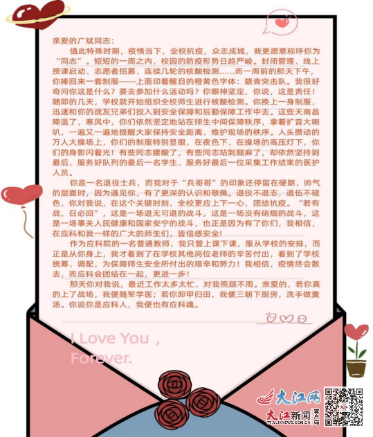 亲爱的广斌同志,在这个特殊时期,疫情当下,我更愿意称呼你为同志。我们恋爱时间不长,我想我们还有更多需要了解的空间。我人生愿望很简单,我希望这一生有一个志同道合的伴侣,有一段弥足珍贵双向奔赴的爱情。你今天去石埠镇做防疫工作,很危险,我很担心,但是我没有劝你请假,因为你跟我说过,在这个关键时刻,全校上下更应该上下一心,团结抗疫,“若有战,召必回”,这是一场退无可退的战斗。作为你的女友,我思考了一夜,在这个危急的时刻,与其在宿舍担心,不如和你一起并肩战斗,所以我也申请参加这次突击队,今早我就会向学院提出申请,我支持你的工作,你也会支持我的,对吗?所有的感情都要经历现实的考验,不是吗?愿我们的感情在突发疫情面前经受考验,愿我们都通过考验获得成长。
