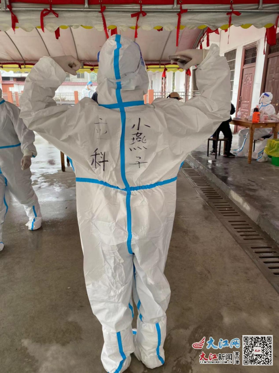 检测期间,黄广斌和吴春燕没有更多的时间交流,只有默默在心里祝福对方保重自己,为了在一群大白中互相认出来,黄广斌在吴春燕的防护服后写了“应科小燕子”,吴春燕在黄广斌的防护服后写了“应科黄小帅”。检测工作开始后,看到对方忙碌的身影,黄广斌心理很踏实,有了女友的协助,采集工作变得更加顺畅,更有效率。