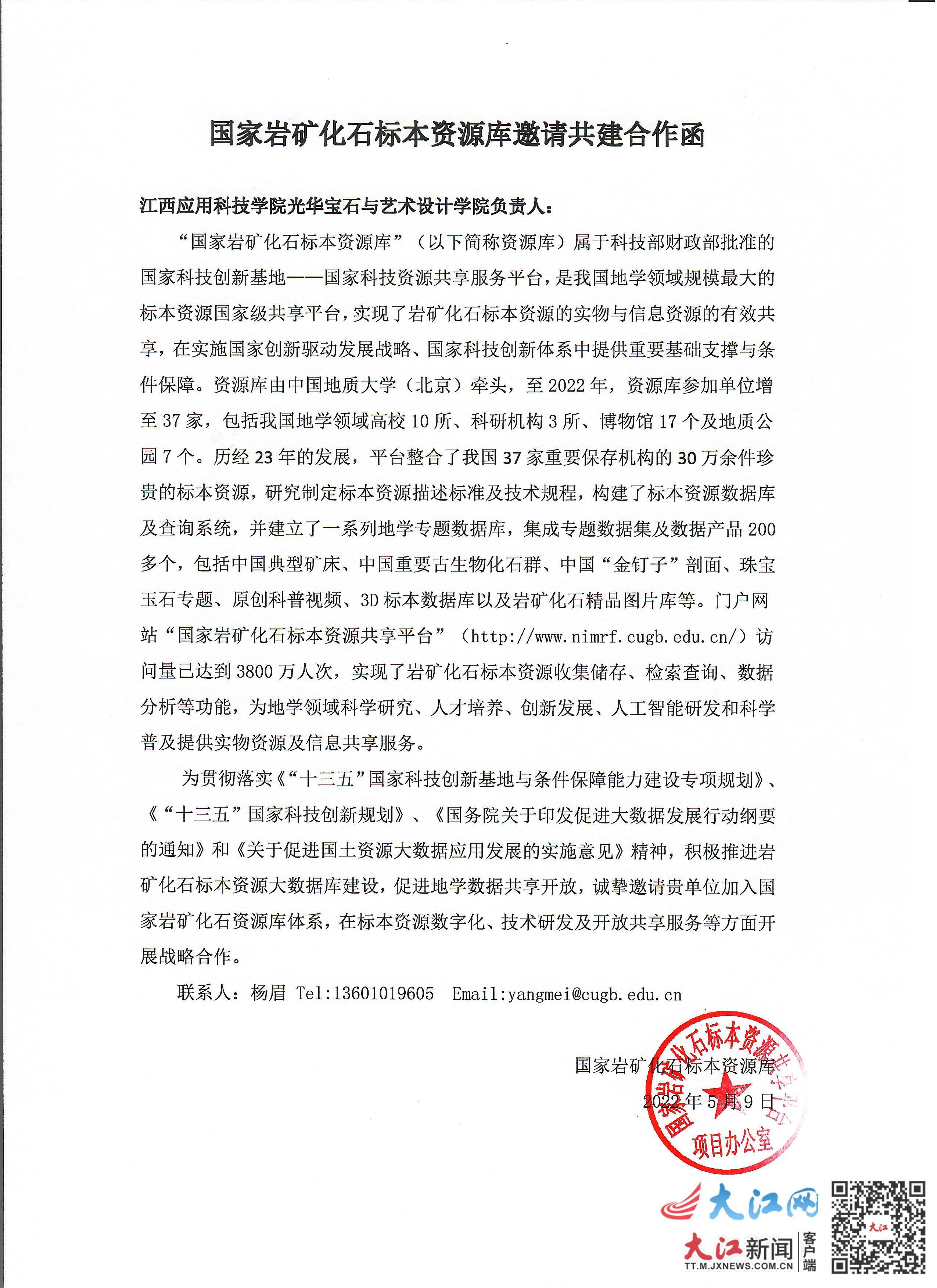 为贯彻落实《“十三五”国家科技创新基地与条件保障能力建设专项规划》《“十三五”国家科技创新规划》《国务院关于印发促进大数据发展行动纲要的通知》和《关于促进国土资源大数据应用发展的实施意见》精神,积极推进岩矿化石标本资源大数据库建设,促进地学数据共享开放,江西应用科技学院光华宝石与艺术设计学院受国家岩矿化石标本资源库邀请加入国家岩矿化石资源库体系,在标本资源数字化、技术研发及开放共享服务等方面开展战略合作。