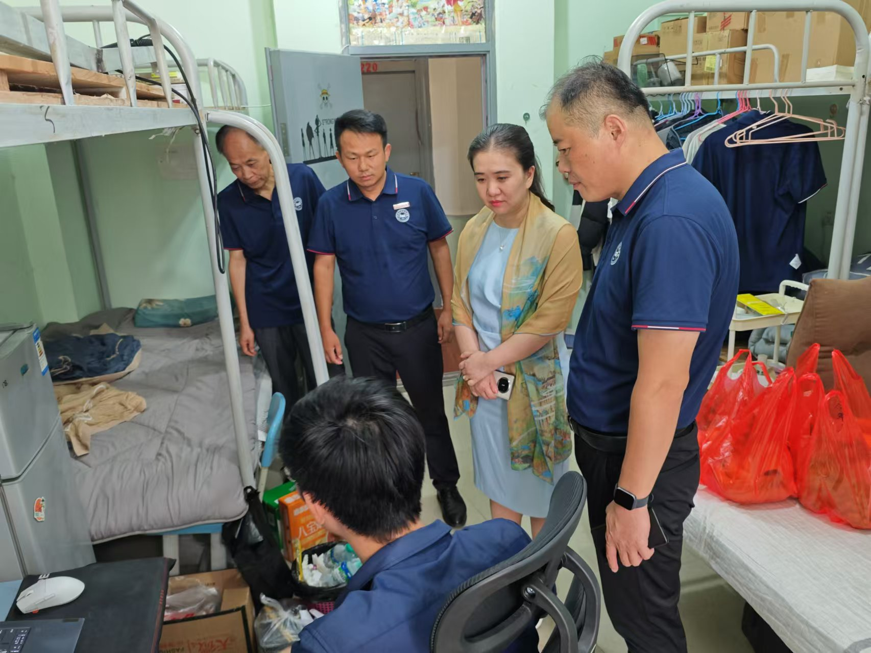 干校长一行来到意外受伤教师宿舍,为教师带来了慰问礼品和教师节祝福。干校长仔细了解了受伤教师的生活和伤病诊疗情况,对受伤教师坚守工作岗位、认真完成教学工作的行为进行了表扬,鼓励受伤教师保持乐观心态,争取早日康复。