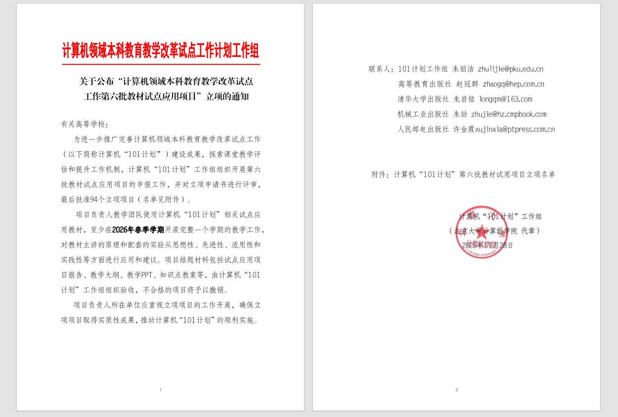 教育部计算机领域本科教育教学改革试点工作自2018年启动以来,已支持全国百余所高校开展新工科建设探索。第六批教材试点应用项目重点遴选体现“学科交叉、产教融合、创新驱动”特色的教材,入选项目将获得专项经费支持,并纳入国家级规划教材培育库。