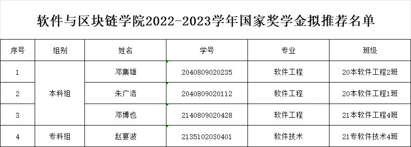 为切实做好我院2022-2023学年国家奖学金的评审工作,根据《江西应用科技学院国家奖学金评审办法(修订)》的通知(应科院资助字〔2022〕1号)文件精神,经学生本人申请、班级民主评选,候选人答辩、结合申报材料等,学院评审委员会进行现场评审讨论通过,现拟推荐以下4名同学作为学院2022-2023学年国家奖学金候选人至学校参加评审,名单如下(排名不分先后),现予以公示: