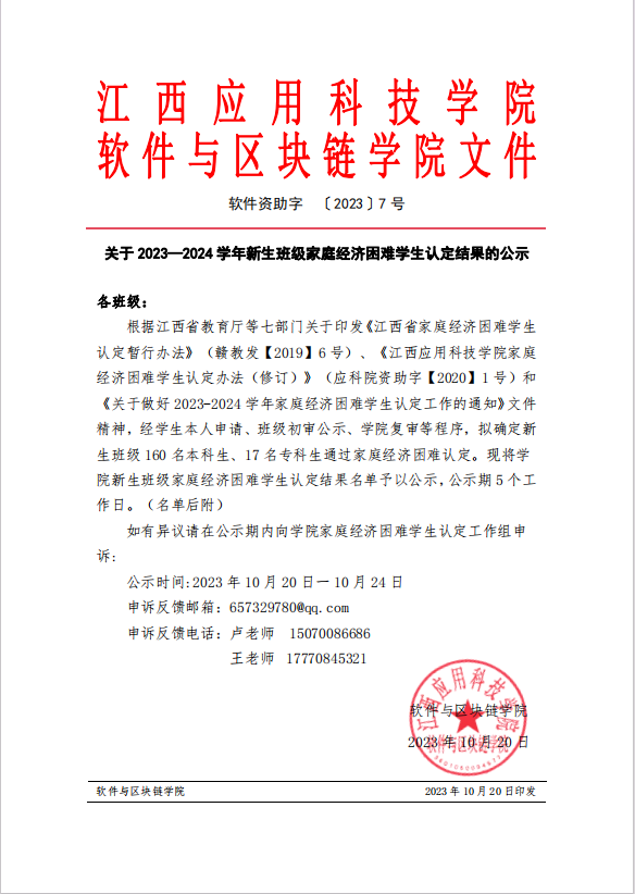 关于2023-2024学年新生班级家庭经济困难学生认定结果的公示