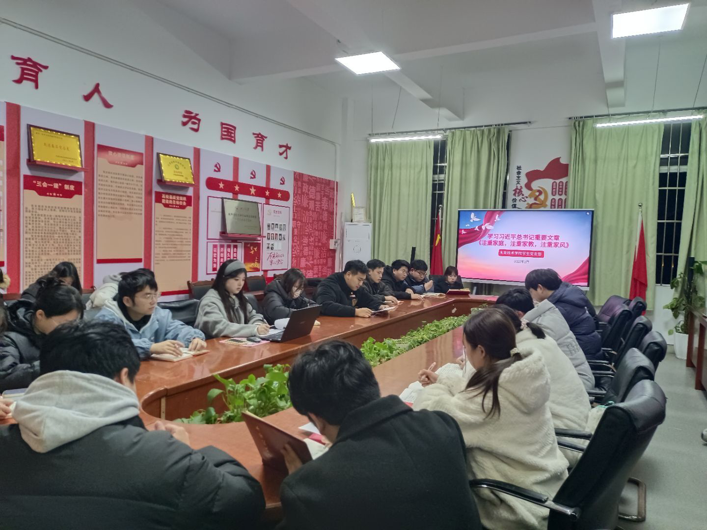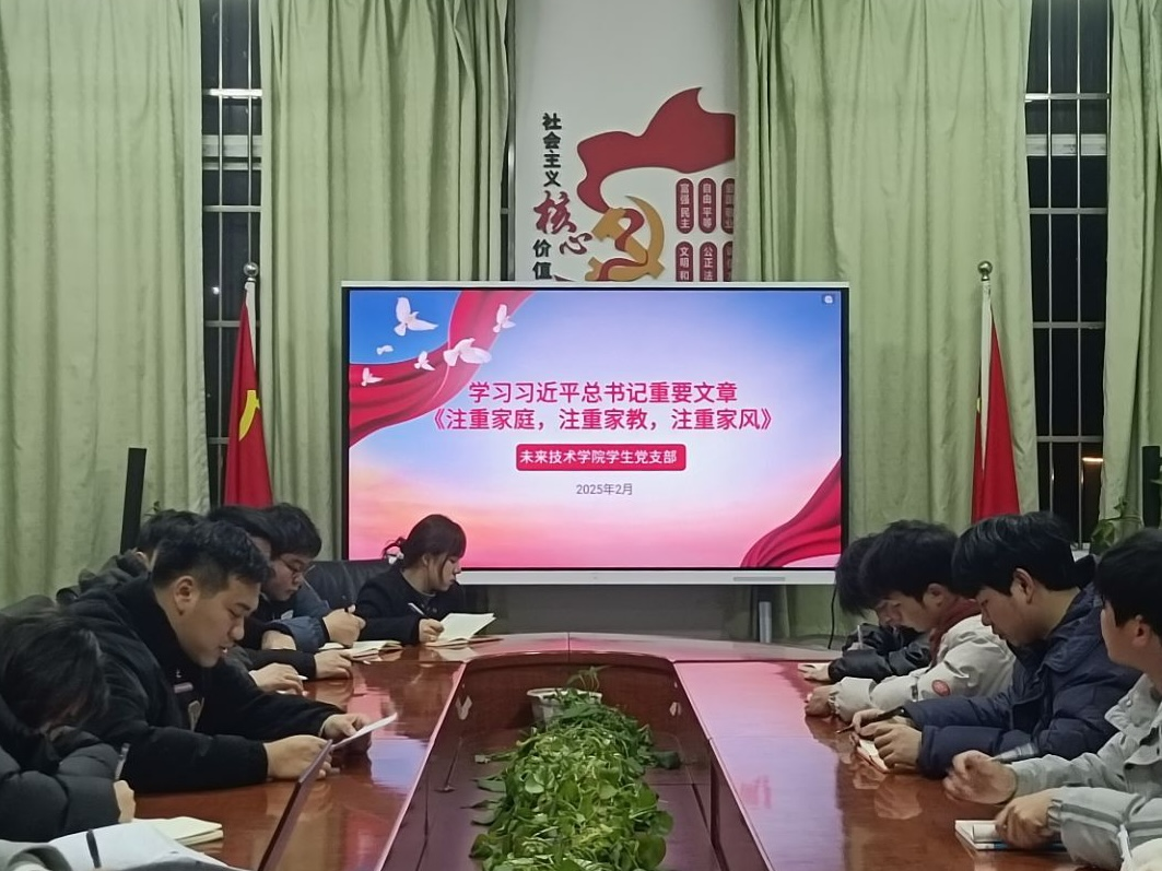 为贯彻落实学院党总支的工作要求,2025年2月25日19:00,未来技术学院学生党支部在党员活动室召开学习习近平总书记的重要文章《注重家庭,注重家教,注重家风》的理论学习会议,会议由学生党支部书记王紫依主持召开,学生党支部全体党员参加。