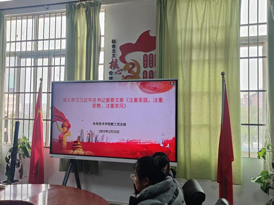 2月25日下午,未来技术学院教工党支部在三达楼210召开理论学习会议,会议内容围绕深入学习习近平总书记重要文章《注重家庭,注重家教,注重家风》展开,进一步认识家庭文明建设的重要性,会议由教工党支部书记卞秀运主持学习,全体党员参加此次会议。