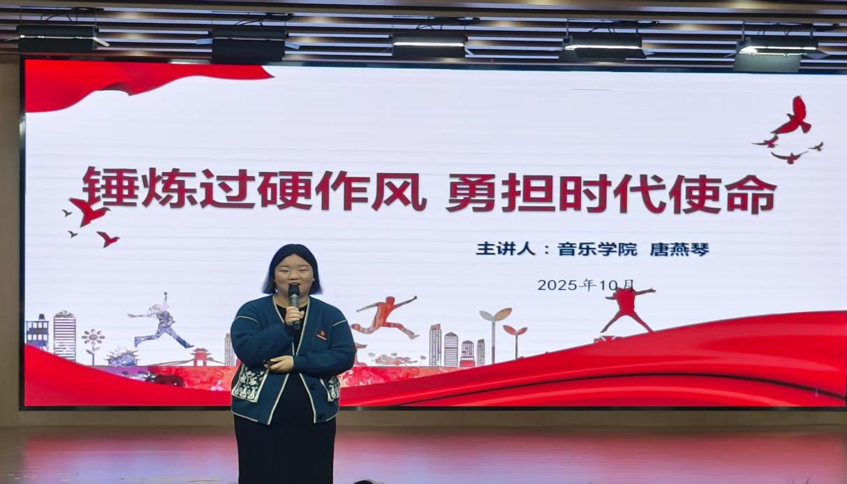 为切实做好入党积极分子的培养教育工作,引导青年学生坚定理想信念、明确责任担当。未来技术学院分党校于2025年10月26日19:00在行知楼辰林音乐厅举办了第31期入党积极分子培训班第七堂党课。本次党课以“锤炼过硬作风,勇担时代使命”为主题,由音乐学院党总支副书记唐燕琴主讲。