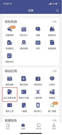 Stp1:打开“智慧应科”APP,点击“应用”,选择“线上电费充值”功能。