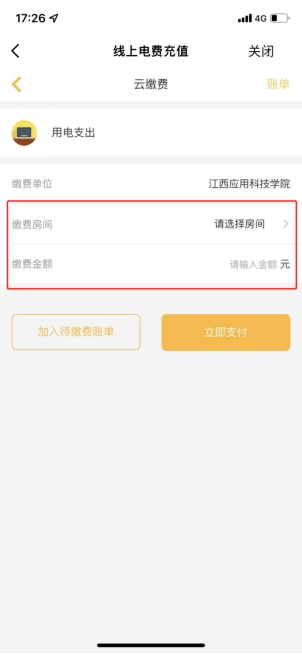 Stp4:在进入的页面中,选择缴费房间,即可显示房间电费余额;输入充值金额,选择“立即支付”即可线上充值电费。