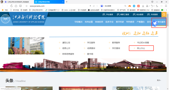 2.进入官网后,点击师生服务栏目内的“网上办公”即可。