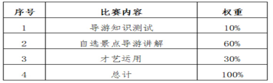 选手总成绩根据各赛项成绩的比值累加计算,竞赛名次按照总成绩高低排序。当总成绩相同时,依次按照自选景点导游讲解、才艺运用的得分高低排序。
