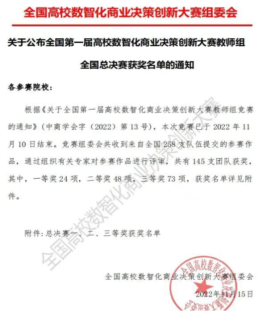近日,由教育部和中国商业经济学会(国家一级学会)主办、西安电子科技大学承办的全国高校数智化商业决策创新大赛(教师组)全国总决赛圆满落幕。全国总决赛中,来自34个省、市、自治区,共258支参赛高校教师队伍提交参赛作品比赛。通过有关专家对参赛作品进行评审,共有145支高校教师团队获奖,其中一等奖24项,二等奖48项,三等奖73项目,我校市场营销专业两位教师荣获二、三等奖。