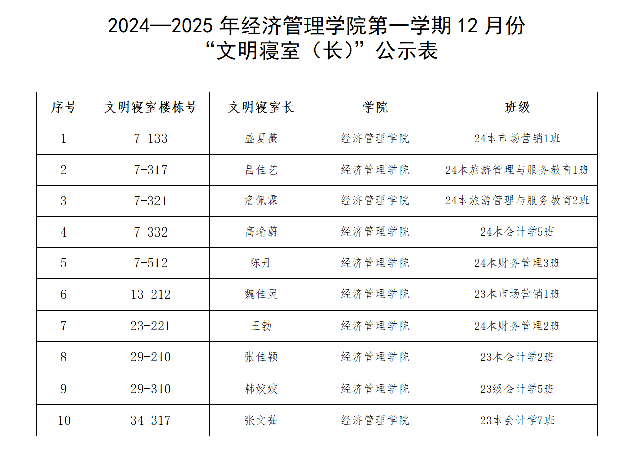 为丰富大学生寝室文化生活,提升寝室文化品位,营造出一个健康、舒适、整洁的学习和生活环境,经济管理学院现将12月份评选的“文明寝室”和“文明寝室长”公示如下: