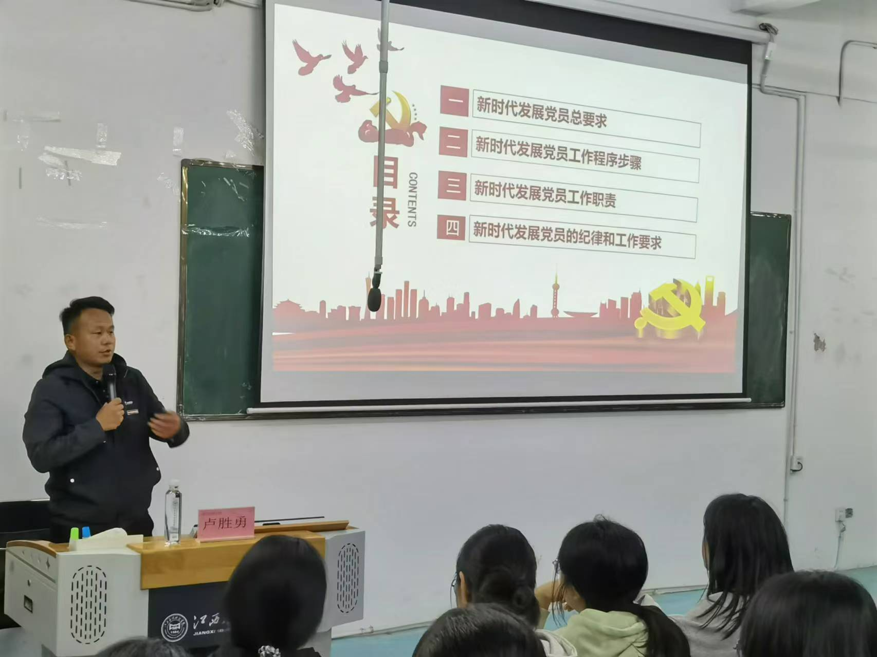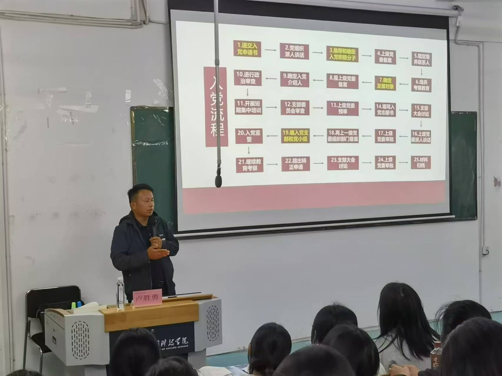 2024年11月5日晚上,经济管理学院第29期入党积极分子培训第十六课于三达楼阶梯六教室开展,本次课程邀请到未来技术学院党总支书记卢胜勇老师为大家进行授课,主题为“怎样做好新时代党员发展工作”。