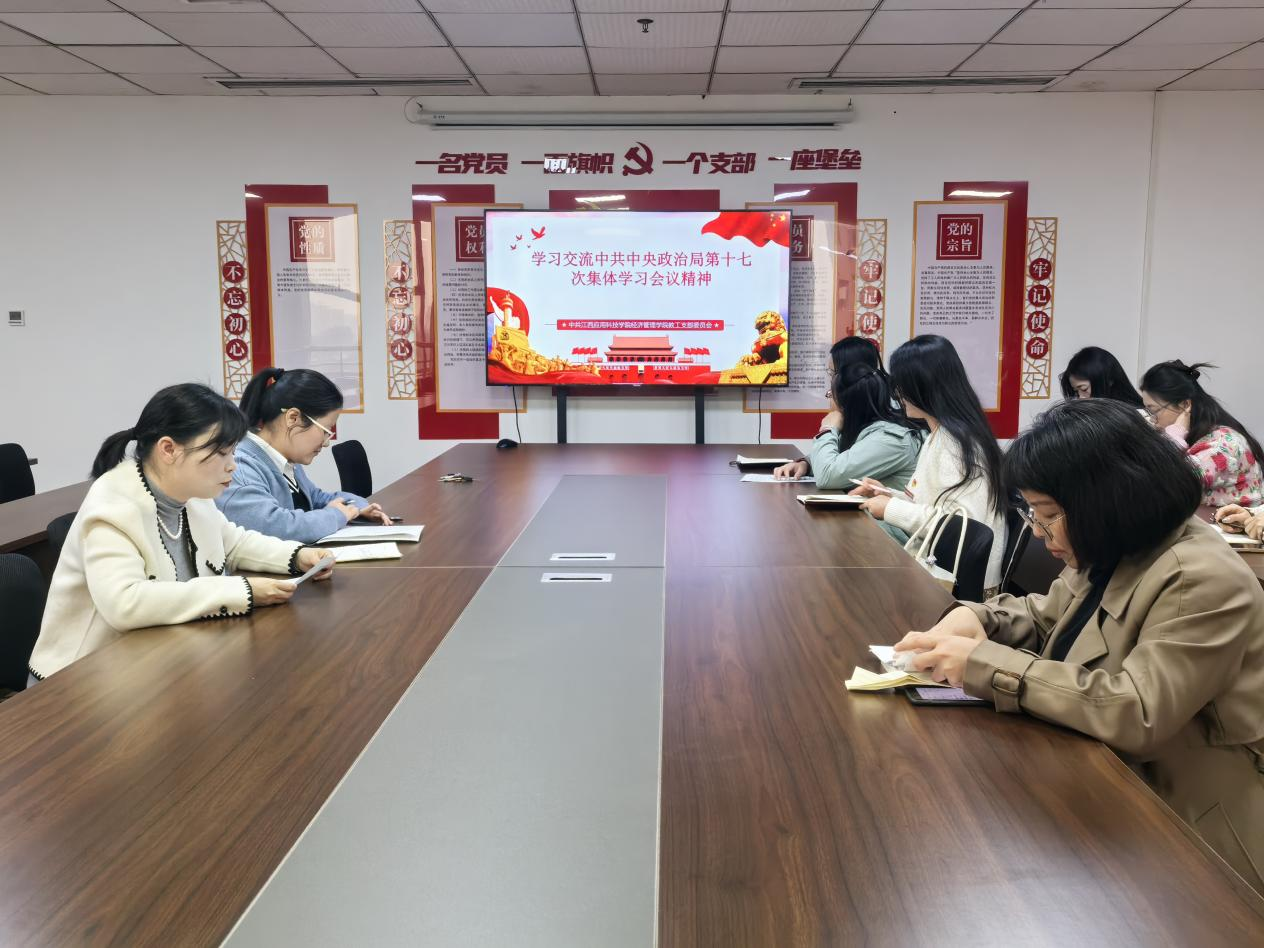 2024年11月20日,教工支部全体党员在综合楼305会议室开展学习贯彻中共中央政治局第十七次集体学习会议精神。本次会议由学院教工党支部书记漆圆方主持召开。