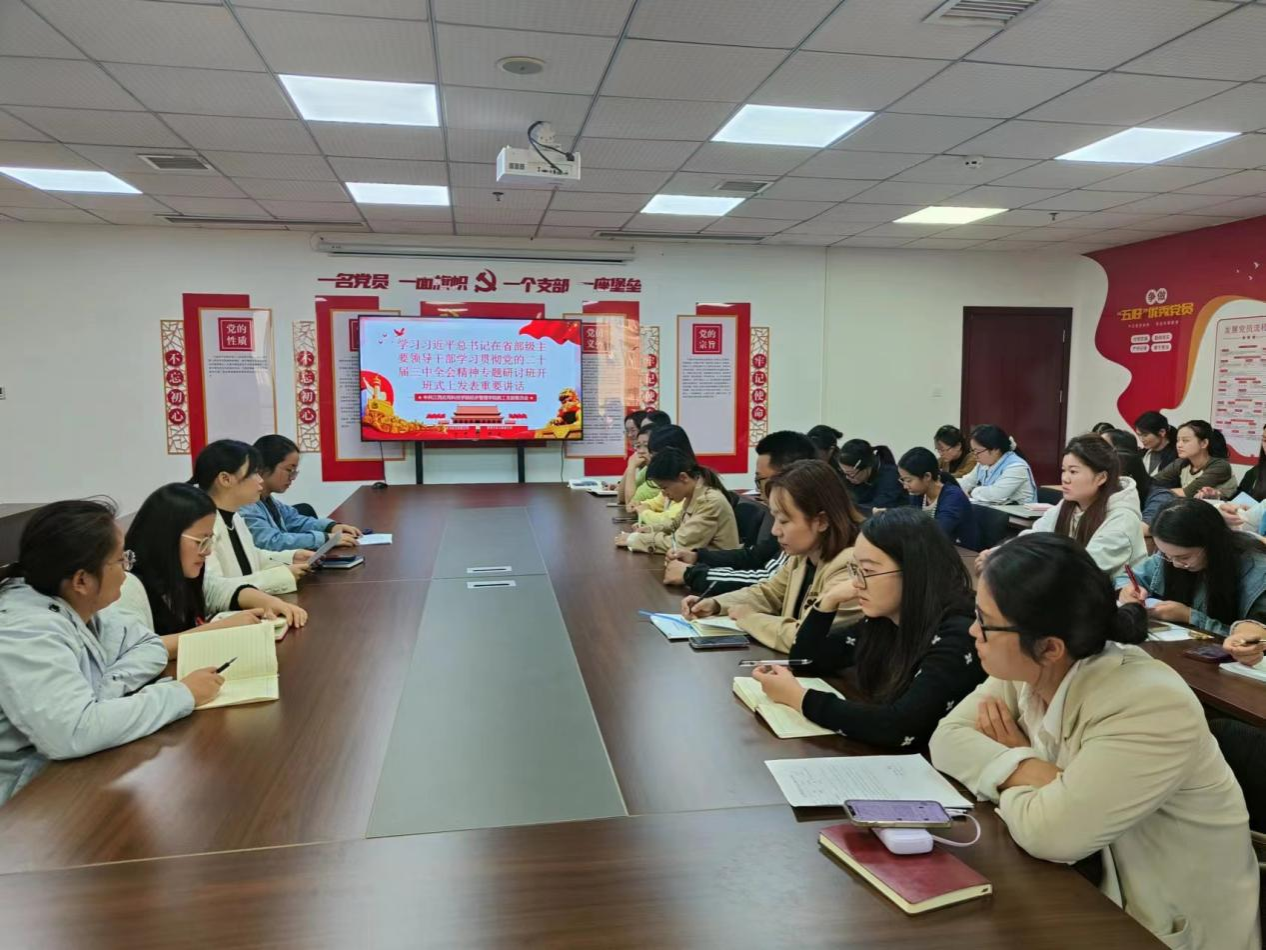 会上,教工党支部书记漆圆方传达习近平总书记在省部级主要领导干部学习贯彻党的二十届三中全会精神专题研讨班开班式上发表重要讲话精神。随后,教工党支部组织委员吴丽霞作了“锚定高质量发展,走好全面深化改革之路”专题报告,杨依、陈雅雯、陈旭瑶等同志做学习心得分享。