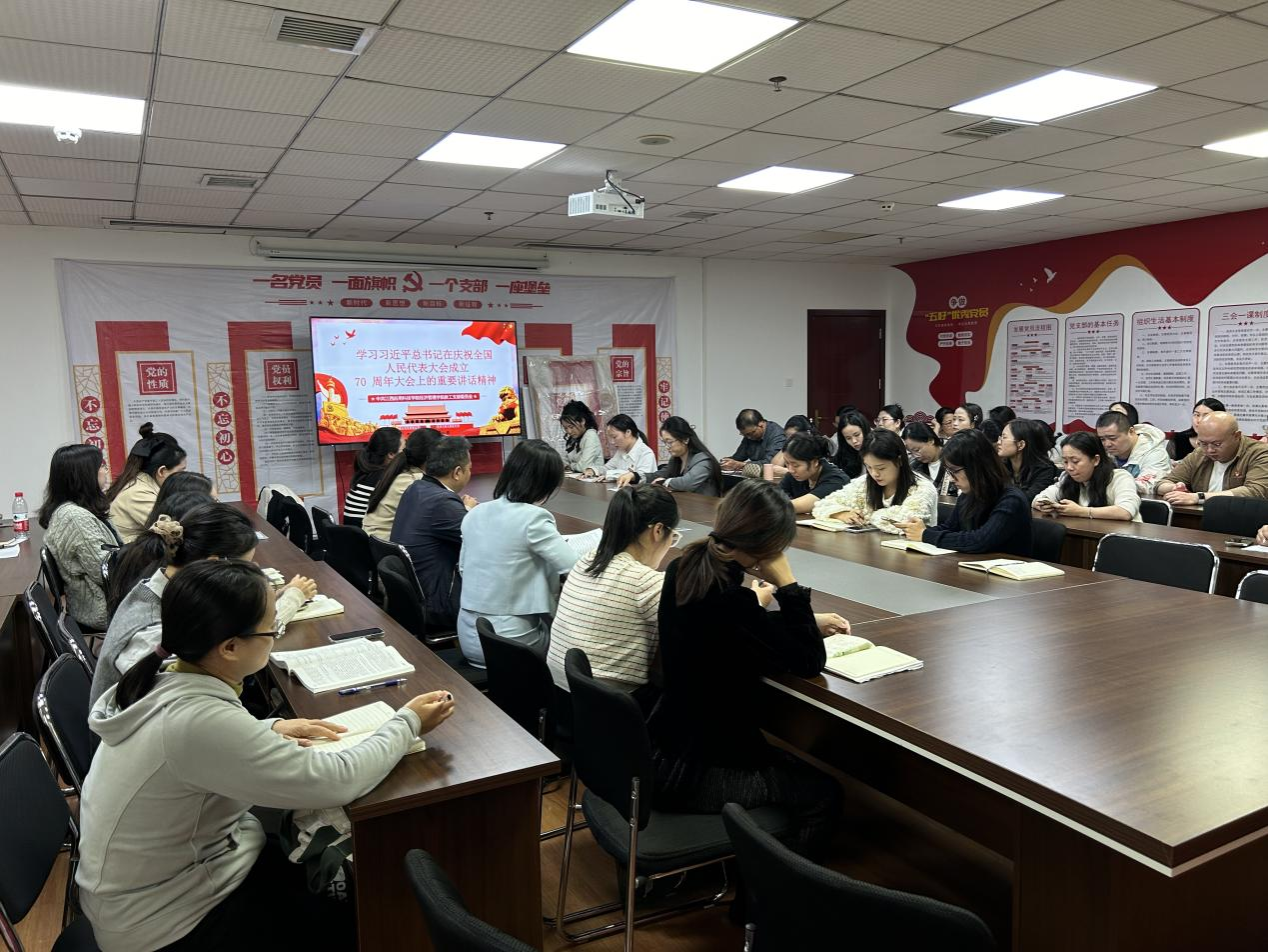 会上,教工党支部书记漆圆方传达了习近平总书记在全国庆祝全国人民代表大会成立70周年大会上的重要讲话精神。随后,观看了央视网播出的国宝档案——“中国共产党第一次全国代表大会”视频,邹琴琴、张慧兰、徐希希等同志分享了学习心得体会。