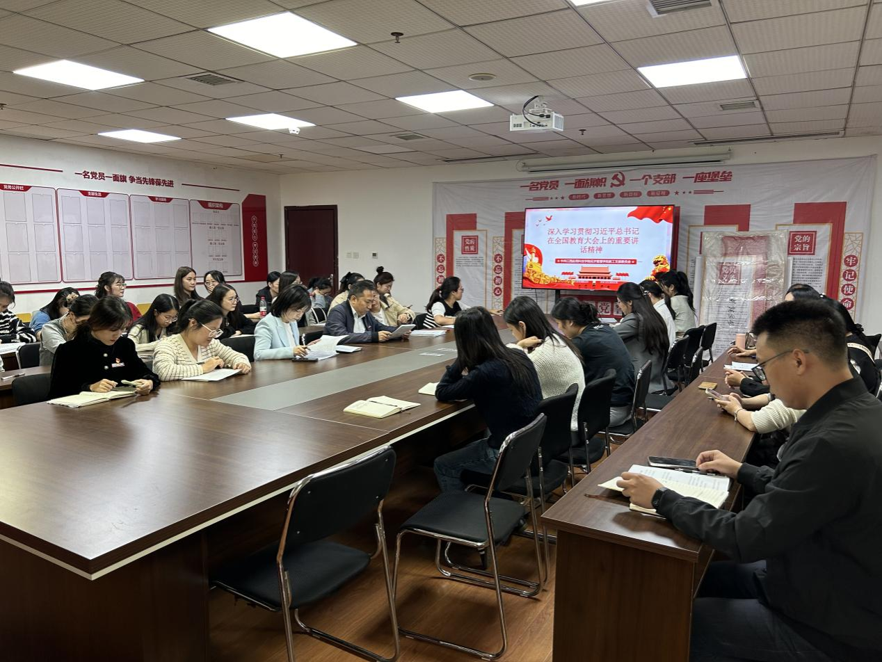 会上,教工党支部书记漆圆方传达了习近平总书记在全国教育大会上的重要讲话精神。随后,教工党支部组织委员吴丽霞作了“应用型本科高校高质量发展的路径”专题报告,陈婷、瞿泱泱、钟兴钰等同志分享了学习心得体会。