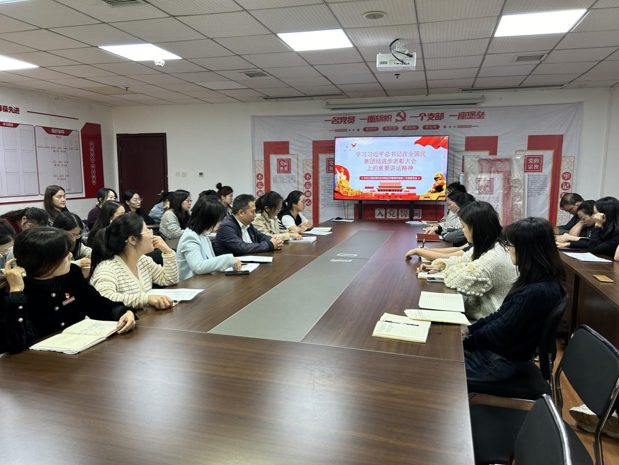 会上,教工党支部书记漆圆方传达了习近平总书记在全国民族团结进步表彰大会上的重要讲话精神。随后,观看了“时代楷模——鲍卫忠先进事迹”,邓影、张婉、黄素华等同志分享了学习心得体会。