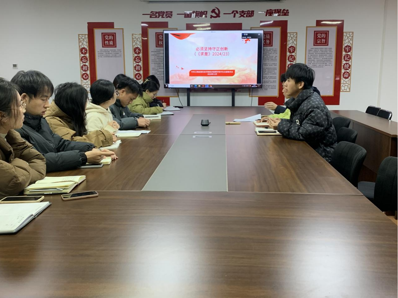 2024年12月19日,经济管理学院学生党支部于综合大楼305开展“必须坚持守正创新(《求是》2024/23)”专题学习会。