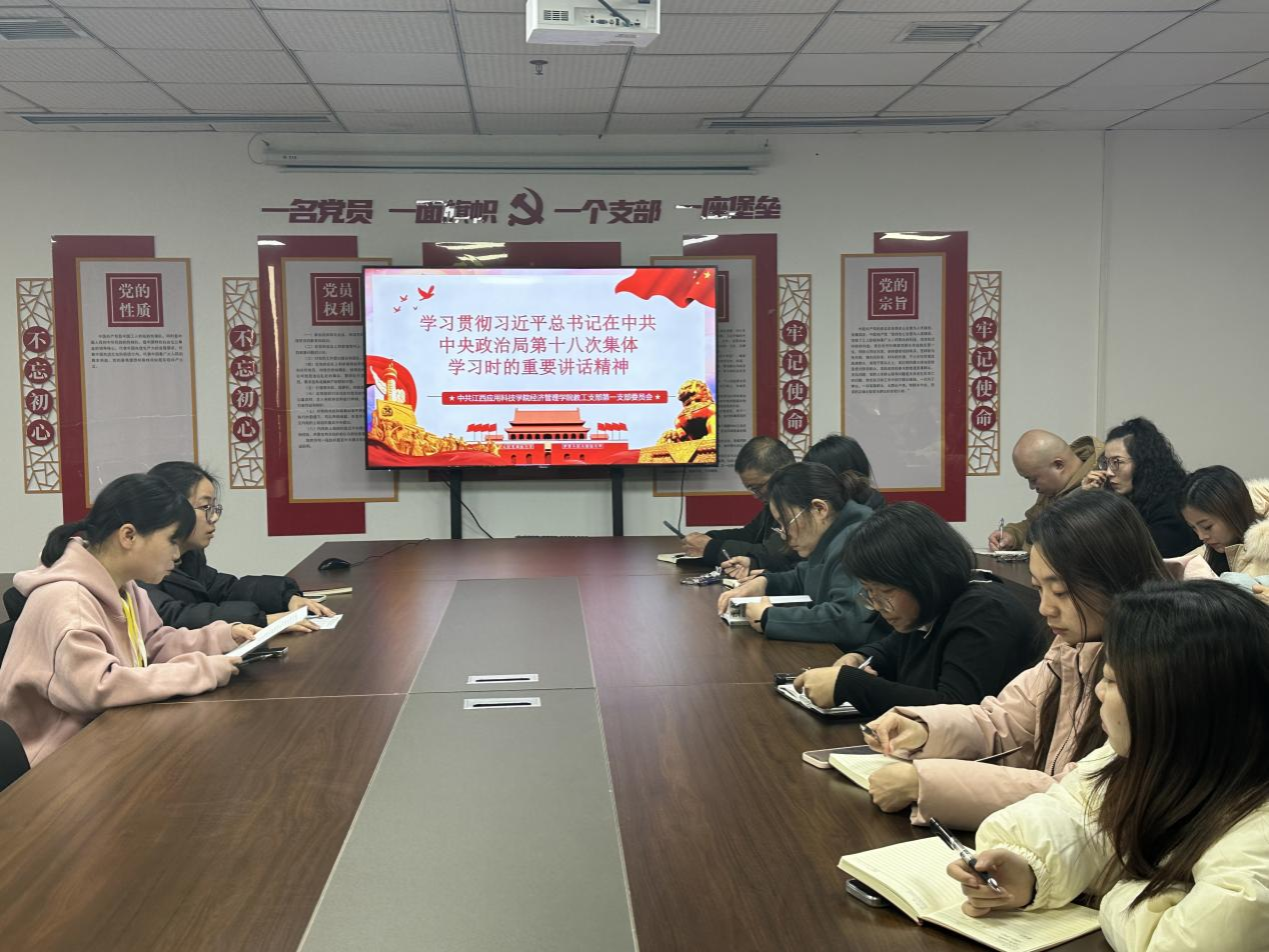 2025年1月2日,经济管理学院教工第一党支部全体党员在综合楼305会议室开展学习贯彻习近平总书记在中共中央政治局第十八次集体学习时的重要讲话精神。本次会议由学院教工第一党支部书记漆圆方主持召开。