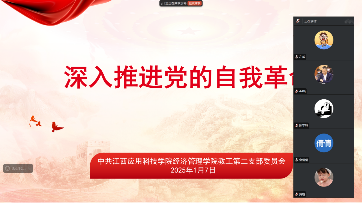2025年1月7日,经济管理学院教工第二党支部于线上腾讯会议开展“深入推进党的自我革命”专题学习会。会议开始,由教工第二党支部左威同志领学“《深入推进党的自我革命》”内容。
