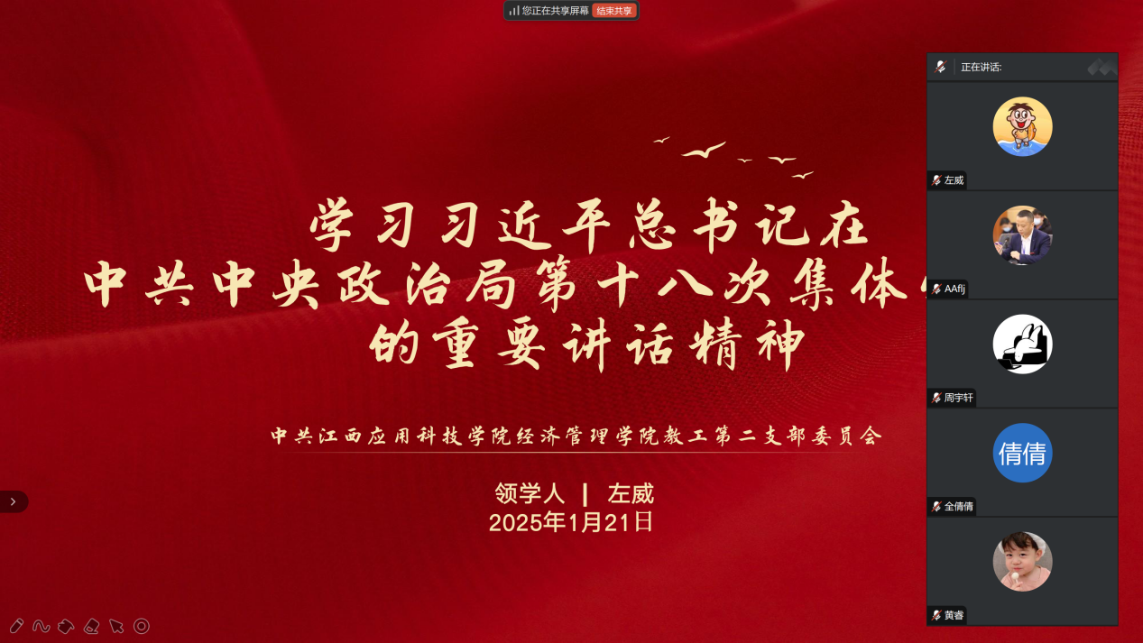2025年1月21日,经济管理学院教工第二党支部于腾讯会议线上开展“学习《习近平文化思想学习纲要》”专题学习会。会议开始,由教工第二党支部左威同志领学《习近平文化思想学习纲要》内容。