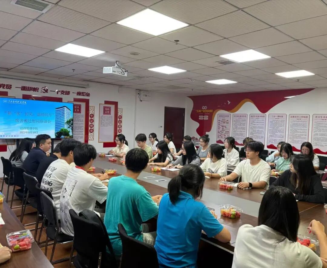 为切实了解学生宿舍搬迁后的入住情况,传递学院对学子的关怀与支持,经济管理学院于2025年9月19日下午,在综合大楼305党员活动室召开红宝石”暖同行,“红晶印”烙新“家”——经济管理学院宿舍搬迁慰问座谈会。学院党总支书记王飞、团总支书记徐传宗与协助宿舍搬迁工作的学生工作者及参与本次搬寝的学生代表们齐聚一堂,共话新宿舍生活,共商服务优化方向。