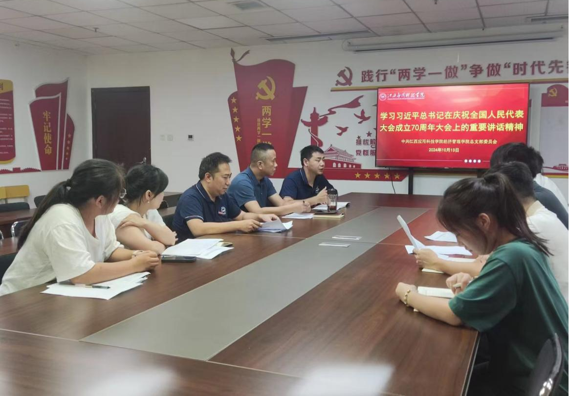 2024年10月13日,经济管理学院于综合楼211党员活动室开了第十次党总支理论学习中心组学习(扩大)会议,传达学习习近平总书记在庆祝全国人民代表大会成立70周年大会上的重要讲话精神。会议由经济管理学院党总支书记王飞主持,全体中心组成员及党务干部参加学习会。