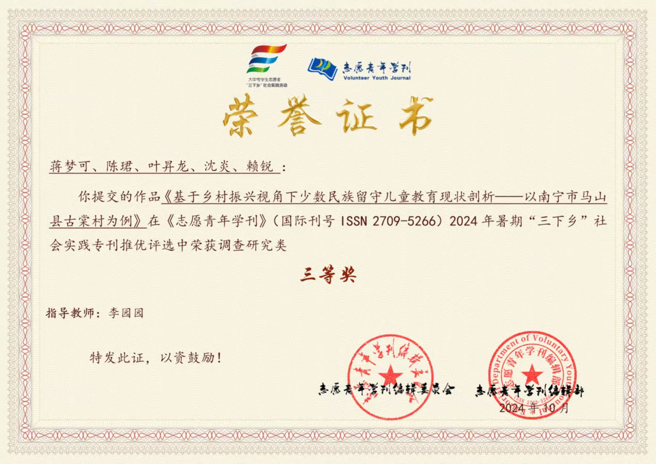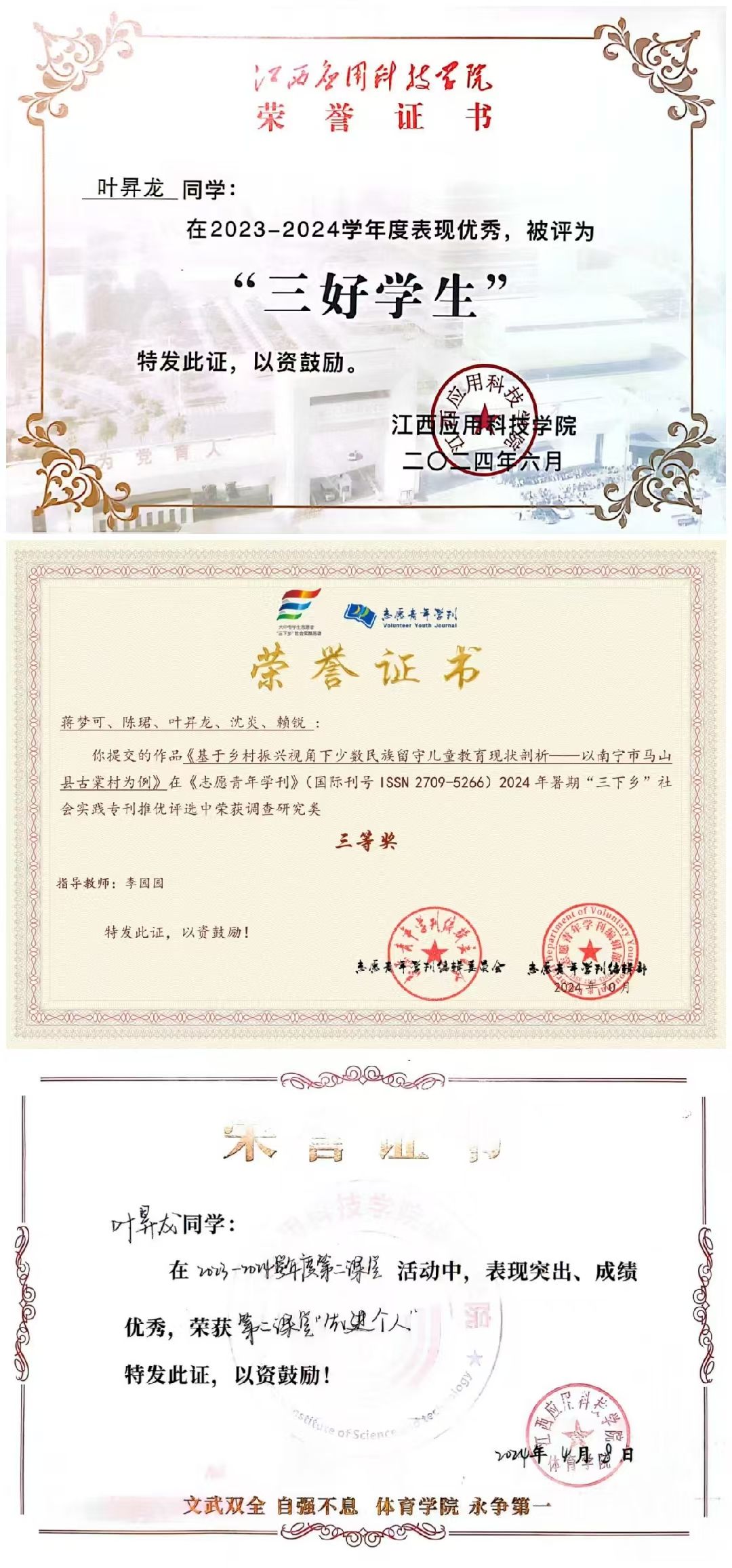 《志愿青年学刊》发刊一项,2024年暑期“三下乡”社会实践专刊推优评选荣获调查研究类三等奖;校级“三好学生”;第二课堂“先进个人”。