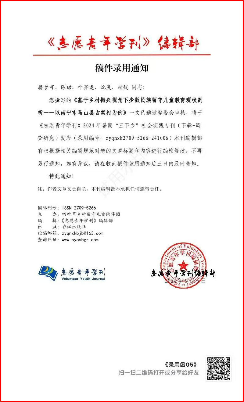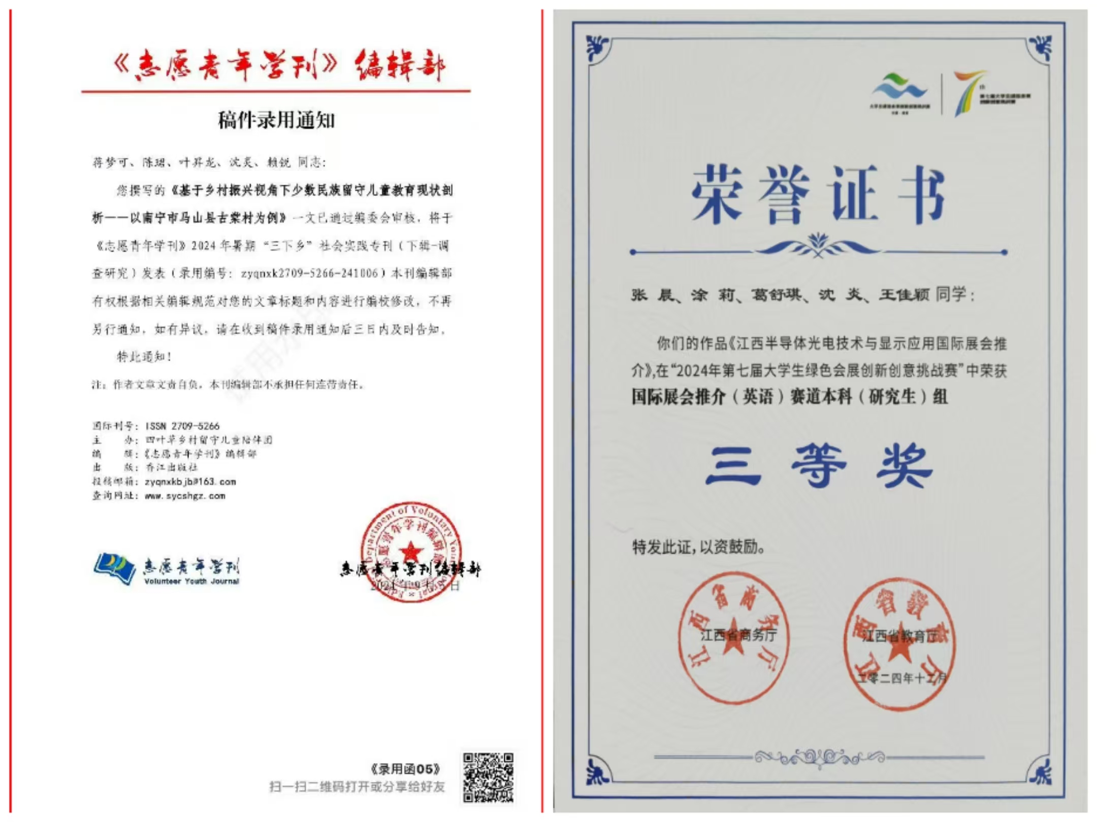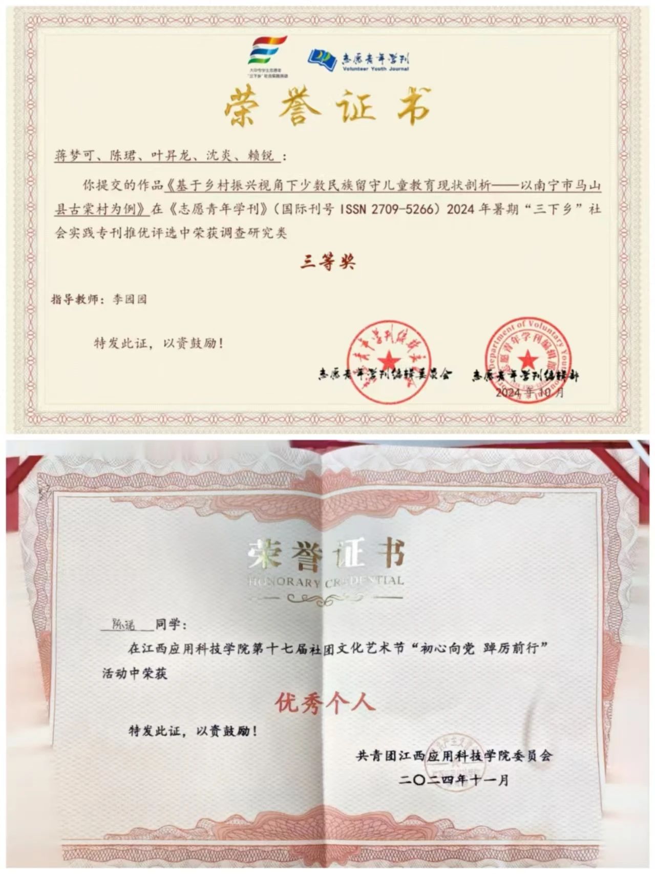 《志愿青年学刊》发刊一项,2024年暑期“三下乡”社会实践专刊推优评选荣获调查研究类三等奖,第十七届社团文化艺术节“优秀个人”。