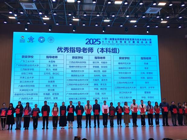 2025年12月19日至12月21日,2025年“一带一路暨金砖国家技能发展与技术创新大赛——AIGC文创设计赛项总决赛”圆满落幕。江西应用科技学院艺术设计学院在本次国家级赛事中表现优异,由郭兰萍、邓靓华两位教师担任指导教师,指导学生李东霖、廖嘉仪组成本科生团队参赛,最终凭借出色的综合表现荣获国赛一等奖,充分展现了学校在人工智能与文创设计融合领域的教学成果与人才培养实力。