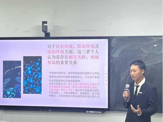 比赛开始前,6名参赛选手通过抽签确定比赛顺序,依次上台进行阐述。每位选手结合PPT演示,热情洋溢、条理清晰地讲解了自己的职业规划,积极展现个人主观能动性。从自我认识、职业探索到执行计划,他们全面展示了自己的职业生涯规划,展现出自己独特的风采。