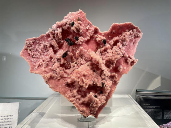 红硅钙锰矿是一种红色硅酸盐矿物,极其珍稀,尤其是它与新发现的新矿物——湖北石的结合更是独一无二。本块红硅钙锰矿与湖北石晶簇,颜色为鲜艳的粉红色并衬以褐色斑点(湖北石),晶体呈细小的纤维放射状,一些晶簇聚集成花朵的造型,十分艳丽珍稀。本展品凭借最大的体积(长40厘米、宽36厘米,且正反面都有)、最珍贵的组合、最完美最精致的呈现,傲视群雄,是目前世界公认最大、最美、最完整的红硅钙锰矿与独特的湖北石新矿物组合标本!