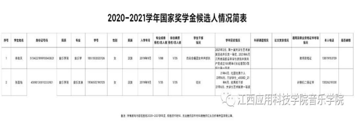 根据省学生资助中心《关于做好2021年普通高校本专科学生国家奖助学金评审发放工作的通知》(赣助中心(2021)20号)文件精神和《江西应用科技学院国家奖学金评审办法》有关文件的规定,经个人申请,班级初审、学院评审小组评审,现将2020--2021学年度音乐学院国家奖学金初审名单向全院予以公示: